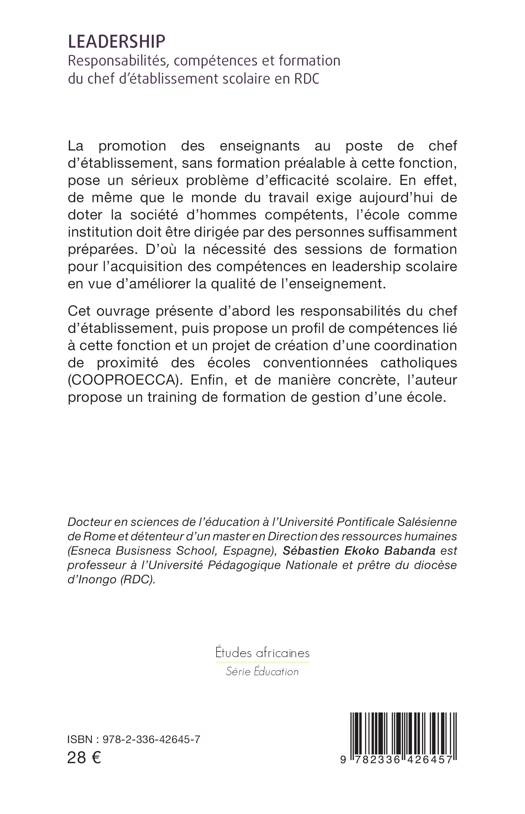La promotion des enseignants au poste de chef d’établissement, sans formation préalable à cette fonction, pose un sérieux problème d’efficacité scolaire. En effet, de même que le monde du travail exige aujourd’hui de doter la société d’hommes compétents, l’école comme institution doit être dirigée par des personnes suffisamment préparées. D’où la nécessité des sessions de formation pour l’acquisition des compétences en leadership scolaire en vue d’améliorer la qualité de l’enseignement. Cet ouvrage présente d’abord les responsabilités du chef d’établissement, puis propose un profil de compétences lié à cette fonction et un projet de création d’une coordination de proximité des écoles conventionnées catholiques (COOPROECCA). Enfin, et de manière concrète, l’auteur propose un training de formation de gestion d’une école.
