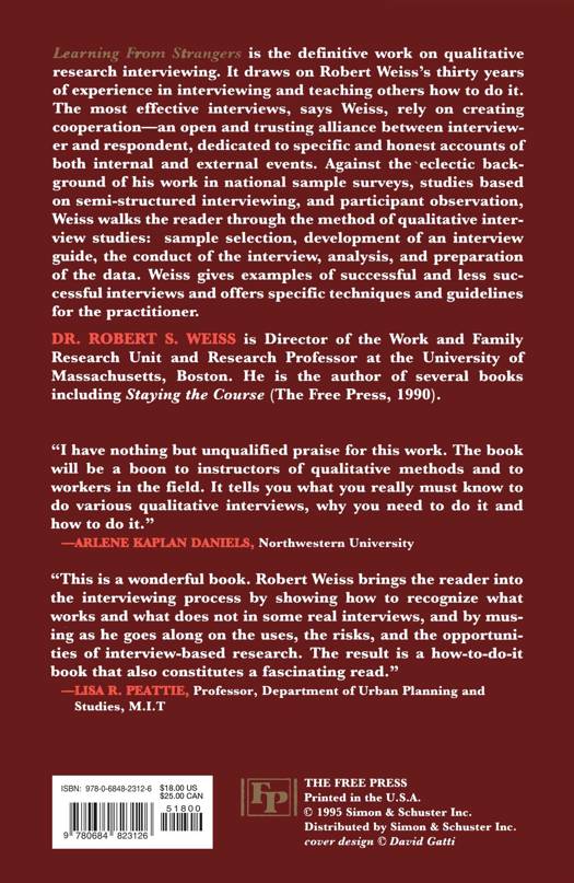 Learning From Strangers is the definitive work on qualitative research interviewing. It draws on Robert Weiss's thirty years of experience in interviewing and teaching others how to do it. The most effective interviews, says Weiss, rely on creating cooperation -- an open and trusting alliance between interviewer and respondent, dedicated to specific and honest accounts of both internal and external events. Against the eclectic background of his work in national sample surveys, studies based on semi-structured interviewing, and participant observation, Weiss walks the reader through the method of qualitative interview studies: sample selection, development of an interview guide, the conduct of the interview, analysis, and preparation of the data. Weiss gives examples of successful and less successful interviews and offers specific techniques and guidelines for the practitioner.