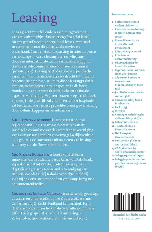 Leasing kent verschillende verschijningsvormen, van een zuivere objectfinanciering (financial lease) tot een gebruiksrecht (operational lease), eventueel in combinatie met diensten, zoals service en onderhoud. Leasing vindt toepassing in uiteenlopende verhoudingen, van de leasing van een vliegtuig door een internationale luchtvaartmaatschappij tot die van enkele zonnepanelen door een consument (private lease). Leasing heeft dan ook vele juridische aspecten, van internationaal privaatrecht tot toezicht op consumentenlease. Auteurs die de leasingpraktijk kennen, behandelen die vele aspecten in dit boek. Aandacht is er ook voor de praktische en de fiscale aspecten van leasing. Wij vertrouwen erop dat dit boek zijn weg in de praktijk zal vinden en dat het inspiratie zal bieden aan de verdere gedachtevorming over leasing door wetenschappers en beleidsmakers.