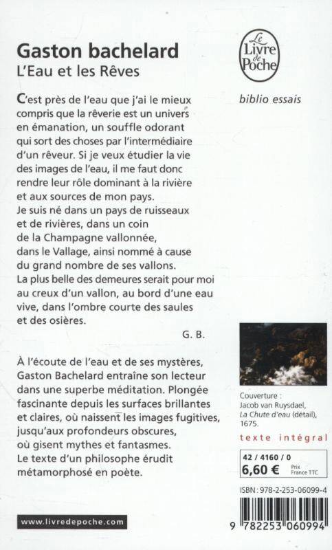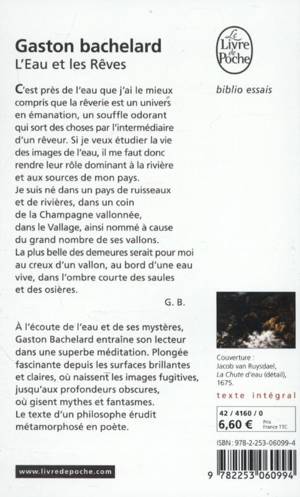 À l’écoute de l’eau et de ses mystères, Gaston Bachelard entraîne son lecteur dans une superbe méditation. Plongée fascinante depuis les surfaces brillantes et claires, où naissent les images fugitives, jusqu’aux profondeurs obscures, où gisent mythes et fantasmes.Le texte d’un philosophe éruditmétamorphosé en poète.