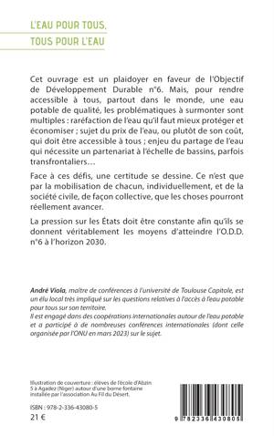 Cet ouvrage est un plaidoyer en faveur de l'Objectif de Développement Durable n°6. Mais, pour rendre accessible à tous, partout dans le monde, une eau potable de qualité, les problématiques à surmonter sont multiples: raréfaction de l'eau qu'il faut mieux protéger et économiser; sujet du prix de l'eau, ou plutôt de son coût, qui doit être accessible à tous; enjeu du partage de l'eau qui nécessite un partenariat à l'échelle de bassins, parfois transfrontaliers... Face à ces défis, une certitude se dessine. Ce n'est que par la mobilisation de chacun, individuellement, et de la société civile, de façon collective, que les choses pourront réellement avancer. La pression sur les États doit être constante afin qu'ils se donnent véritablement les moyens d'atteindre l'O.D.D. n°6 à l'horizon 2030.