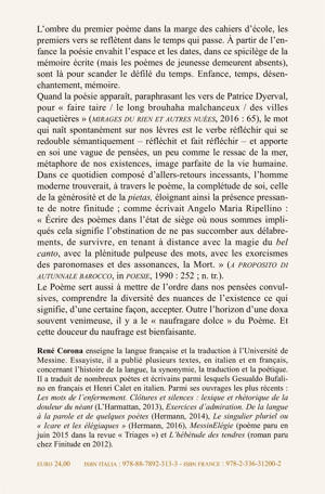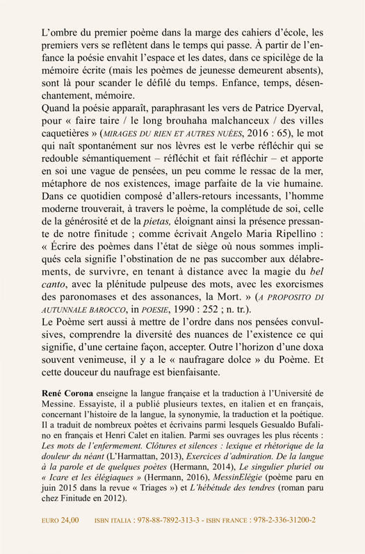 L'ombre du premier poème dans la marge des cahiers d'école, les premiers vers se reflètent dans le temps qui passe. À partir de l'enfance la poésie envahit l'espace et les dates, dans ce spicilège de la mémoire écrite (mais les poèmes de jeunesse demeurent absents), sont là pour scander le défi lé du temps. Enfance, temps, désenchantement, mémoire.