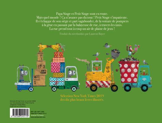 Après le succès de «Où est le dragon?» de Leo Timmers, un nouvel album qui a fait partie des dix plus beaux albums illustrés sélectionnés par le «New York Times» en 2019. Là encore, détails fourmillants et insolites, jeux de superposition et de couleurs rythment une narration inventive: Petit singe est en voiture avec Papa singe. Mais ça n'avance pas du tout et Petit Singe s'impatiente. Il s'échappe de son siège et part vagabonder, de la voiture de pompiers à la grue en passant par la balayeuse de rue, et les taxis. La rue prend tout à coup un air de plaine de jeux ! Un album réjouissant qui invite en même temps à réfléchir aux modes de transport alternatifs et aux travers des excès de circulation automobile.