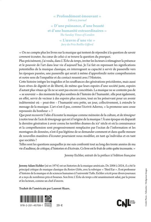Plus précisément, j’ai voulu, dans L’Écho du temps, inviter les lecteurs à réimaginer la présence et le pouvoir de l’art dans leur vie d’aujourd’hui. Je l’ai fait en repensant les significations potentielles de la musique classique, en interrogeant sa capacité à servir de passerelle vers les époques passées, une passerelle qui serait à même d’approfondir notre compréhension et notre sens de l’empathie et du contact ressenti avec l’Histoire.