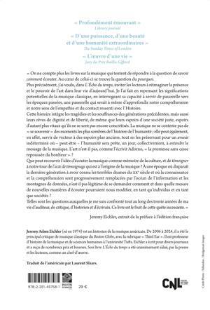 Cette histoire intègre les tragédies et les souffrances des générations précédentes, mais aussi leurs rêves de dignité et de liberté, de même que leurs espoirs d’une société juste, espoirs d’autant plus vitaux qu’ils ne se sont pas encore concrétisés. La musique ne se contente pas de « se souvenir » des moments les plus sombres de l’histoire de l’humanité ; elle peut également, en effet, servir de vecteur à des espoirs plus anciens, tout en les préservant pour un avenir indéterminé où – peut-être – l’humanité sera prête, un jour, collectivement, à entendre le message de la musique. L’art n’est-il pas, comme l’écrivit Adorno, « la promesse sans cesse repoussée du bonheur » ?