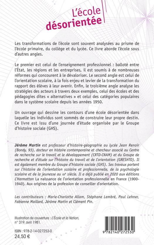 Les transformations de l'école sont souvent analysées au prisme de l'école primaire, du collège et du lycée. Ce livre aborde l'école sous d'autres angles. Le premier est celui de l'enseignement professionnel : balloté entre l'État, les régions et les entreprises, il est soumis à de nombreuses réformes qui concourent à le dévaloriser. Le second angle est celui de l'orientation scolaire, à la fois enjeu et levier de la transformation du rapport des élèves à leur avenir. Enfin, le troisième angle analyse les stratégies des acteurs à travers deux exemples, celui des écoles et des* pédagogies dites « alternatives » et celui des catégories populaires dans le système scolaire depuis les années 1950. Un ouvrage qui dessine les contours d'une école désorientée dans laquelle les individus sont sommés de construire leur propre destin. Ce livre est issu d'une journée d'étude organisée par le Groupe d'histoire sociale (GHS).