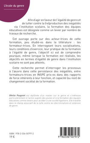 Afin d'agir en faveur de l'égalité de genre et de lutter contre la (re)production des inégalités via l'institution scolaire, la formation des équipes éducatives est désignée comme un levier par nombre de travaux de recherche. Cet ouvrage porte sur des acteur-trices de cette formation, peu étudié-es dans la littérature: les formateur-trices. En interrogeant leurs socialisations, leurs conditions d'exercice, leur pratique de la formation à l'égalité de genre, l'objectif ici est de comprendre pourquoi, même lorsque la formation est réalisée, les objectifs en termes d'égalité de genre dans l'institution scolaire ne sont pas atteints. Cette recherche permet d'interroger les processus à l'oeuvre dans cette persistance des inégalités, entre formateurs-trices en INSPE pris-es dans des rapports de force inhérents à leur fonction, et capacité (ou non) de changement sociétal de la formation.