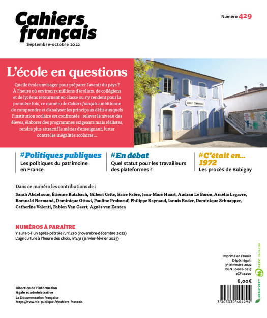 Ce numéro de Cahiers français s’interroge sur les principes fondamentaux de l’école ainsi que sur les métiers de l’enseignement, notamment celui des professeurs.