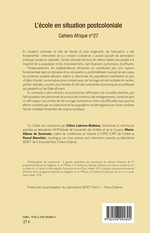 En situation coloniale, le rôle de l'école fut un instrument de la "mission civilisatrice" autant qu'un outil de domination politique, sociale et culturelle. Paradoxalement, les indépendances africaines ne constituent pas une rupture fondamentale. L'affirmation de nouvelles identités, par l'africanisation des personnels et surtout des contenus des enseignements, constitue un défi majeur. Ces articles montrent les freins, les difficultés mais aussi les efforts consentis par les institutions et les populations.
