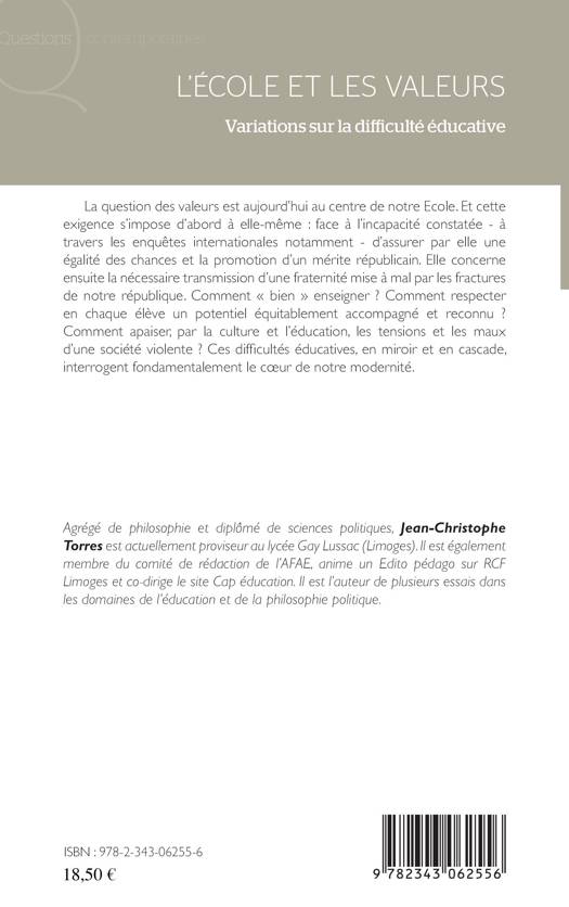 La question des valeurs est aujourd'hui au centre de notre École. Et cette exigence s'impose d'abord à elle-même : face à l'incapacité constatée d'assurer par elle une égalité des chances et la promotion d'un mérite républicain. Elle concerne ensuite la nécessaire transmission d'une fraternité mise à mal par les fractures de notre république. Comment « bien » enseigner ? Comment respecter en chaque élève un potentiel équitablement accompagné et reconnu ? Comment apaiser, par la culture et l'éducation, les tensions et les maux d'une société violente ?
