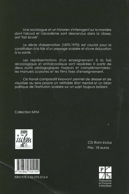Se fondant sur des manuels scolaires ainsi que sur des films fixes d'enseignement fournis sur le CD-ROM, les auteurs rendent compte des campagnes d'information menées sur les dangers de l'alcoolisme en milieu scolaire. Ils abordent ainsi les problématiques liées à l'éducation à la santé des jeunes et à une politique de santé très dépendante de l'environnement socio-économique de la France.