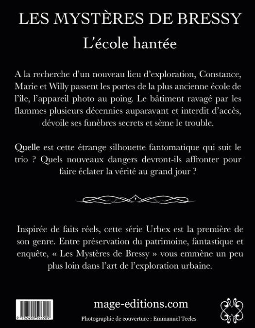 A la recherche d’un nouveau lieu d’exploration, Constance, Marie et Willy passent les portes de la plus ancienne école de l’île, l’appareil photo au poing. Le bâtiment ravagé par les flammes plusieurs décennies auparavant et interdit d’accès, dévoile ses funèbres secrets et sème le trouble. Quelle est cette étrange silhouette fantomatique qui suit le trio ? Quels nouveaux dangers devront-ils affronter pour faire éclater la vérité au grand jour ? Cette série Urbex est la première de son genre. Entre préservation du patrimoine, fantastique et enquête, « Les Mystères de Bressy » vous emmène un peu plus loin dans l’art de l’exploration urbaine.