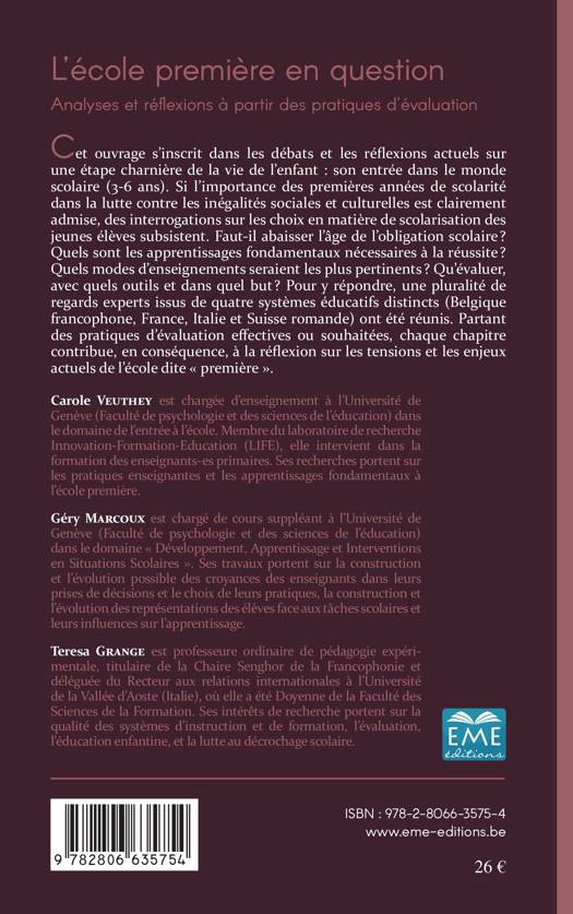 Cet ouvrage s'inscrit dans les débats et les réflexions actuels sur une étape charnière de la vie de l'enfant: son entrée dans le monde scolaire (3-6 ans). Si l'importance des premières années de scolarité dans la lutte contre les inégalités sociales et culturelles est clairement admise, des interrogations sur les choix en matière de scolarisation des jeunes élèves subsistent. Faut-il abaisser l'âge de l'obligation scolaire? Quels sont les apprentissages fondamentaux nécessaires à la réussite? Quels modes d'enseignement seraient les plus pertinents? Qu'évaluer, avec quels outils et dans quel but? Pour y répondre, une pluralité de regards experts issus de quatre systèmes éducatifs distincts (Belgique francophone, France, Italie et Suisse romande) ont été réunis. Partant des pratiques d'évaluation effectives ou souhaitées, chaque chapitre contribue, en conséquence, à la réflexion sur les tensions et les enjeux actuels de l'école dite "première".