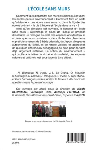 Comment faire disparaître ces murs invisibles qui coupent les écoles de leur environnement ? Comment faire en sorte qu'advienne « une école sans murs », dans la lignée des écoles prônant « la vie à l'école et l'école dans la vie » ? Ainsi qu'en témoigne cet ouvrage, le concept d'« école sans murs » réinterroge la place de l'école et propose d'instaurer un dialogue au-delà des espaces occidentaux et urbains que nous connaissons, de solliciter des chercheurs et praticiens venant de Sibérie orientale, du Japon, d'espaces autochtones du Brésil, et de rendre visibles les approches de quelques chercheurs-pédagogues de pays pour certains déjà largement métissés. La notion d'« environnement est sous-jacente à ce débat.
