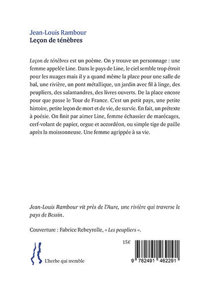 Leçon de ténèbres est un poème. On y trouve un personnage : une femme appelée Line. Dans le pays de Line, le ciel semble trop étroit pour les nuages mais il y a quand même la place pour une salle de bal, une rivière, un pont métallique, un jardin avec fil à linge, des peupliers, des salamandres, des livres ouverts. De la place encore pour que passe le Tour de France. C’est un petit pays, une petite histoire, petite leçon de mort et de vie, de survie. En fait, un prétexte à poésie. On finit par aimer Line, femme échassier de marécages, cerf-volant de papier, orgue et accordéon, ou simple tige de paille après la moissonneuse. Une femme agrippée à sa vie.