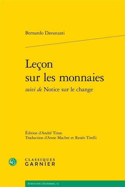 Les travaux économiques de Bernardo Davanzati se limitent à deux écrits : la Notizia de'cambi (Notice sur le change) et Lezione delle monete (Leçon sur les monnaies). Ces textes ont été très appréciés du vivant de l'auteur et ont été réédités plusieurs fois par la suite. Au fil du temps, ces courts écrits, dans lesquels la profonde connaissance pratique de la mercatura et la capacité analytique s'harmonisent et produisent des analyses brillantes et élégantes, ont donné à Davanzati une réputation bien méritée dans le domaine de l'analyse économique. Pour la première fois ces deux textes sont traduits ici en français.