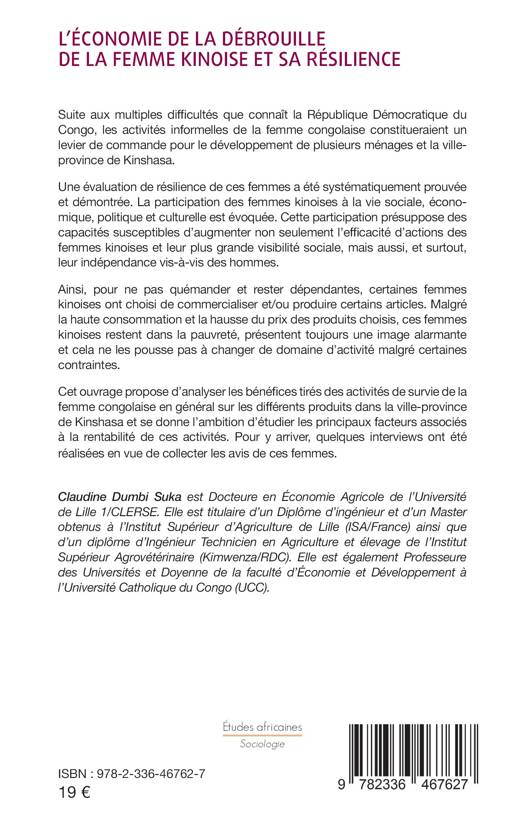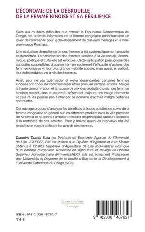 Suite aux multiples difficultés que connaît la République Démocratique du Congo, les activités informelles de la femme Congolaise constitueraient un levier de commande pour le développement de plusieurs ménages et la ville-province de Kinshasa. Une évaluation de résilience de ces femmes a été systématiquement prouvée et démontrée. La participation des femmes Kinoises à la vie sociale, économique, politique et culturelle est évoquée. Cette participation présuppose des capacités susceptibles d'augmenter non seulement l'efficacité d'actions des femmes Kinoises et leur plus grande visibilité sociale, mais aussi, et surtout, leur indépendance vis-à-vis des hommes. Ainsi, pour ne pas quémander et rester dépendantes, certaines femmes Kinoises ont choisi de commercialiser et/ou produire certains articles. Malgré la haute consommation et la hausse du prix des produits choisis, ces femmes Kinoises restent dans la pauvreté, présentent toujours une image alarmante et cela ne les pousse pas à changer de domaine d'activité malgré certaines contraintes. Cet ouvrage propose d'analyser les bénéfices tirés des activités de survie de la femme congolaise en général sur les différents produits dans la ville-province de Kinshasa et se donne l'ambition d'étudier les principaux facteurs associés à la rentabilité de ces activités. Pour y arriver, quelques interviews ont été réalisées en vue de collecter les avis de ces femmes.