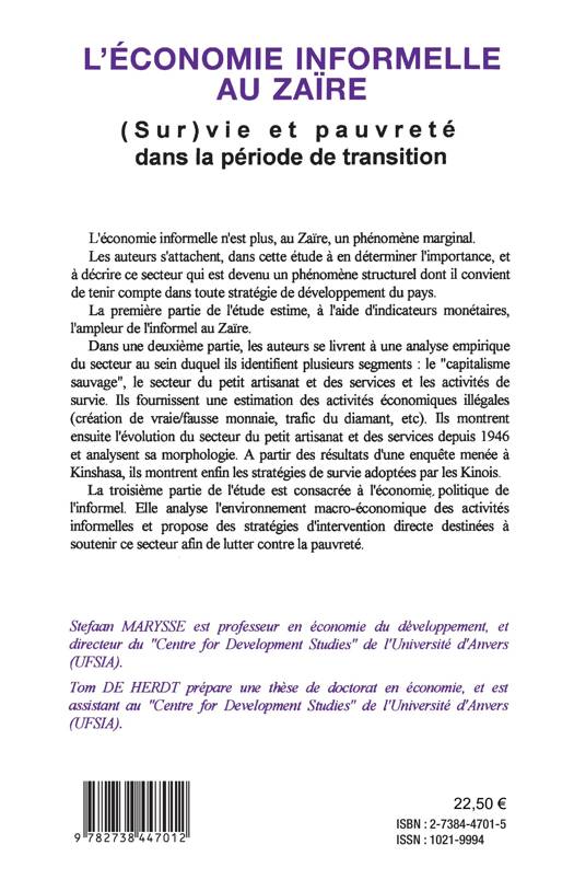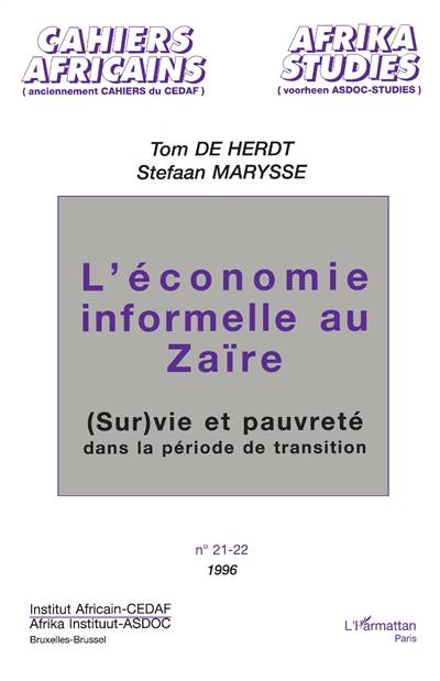 L'économie informelle n'est plus, au Zaïre, un phénomène marginal.. Les auteurs s'attachent, dans cette étude à en déterminer l'importance, et à décrire ce secteur qui est devenu un phénomène structurel dont il convient de tenir compte dans toute stratégie de développement du pays.. La première partie de l'étude estime, à l'aide d'indicateurs monétaires, l'ampleur de l'informel au Zaïre.. Dans une deuxième partie, les auteurs se livrent à une analyse empirique du secteur au sein duquel ils identifient plusieurs segments : le "capitalisme sauvage", le secteur du petit artisanat et des services et les activités de survie. Ils fournissent une estimation des activités économiques illégales (création de vraie/fausse monnaie, trafic du diamant, etc). Ils montrent ensuite l'évolution du secteur du petit artisanat et des services depuis 1946 et analysent sa morphologie. A partir des résultats d'une enquête menée à Kinshasa, ils montrent enfin les stratégies de survie adoptées par les Kinois.. La troisième partie de l'étude est consacrée à l'économie politique de l'informel. Elle analyse l'environnement macro-économique des activités informelles et propose des stratégies d'intervention directe destinées à soutenir ce secteur afin de lutter contre la pauvreté...