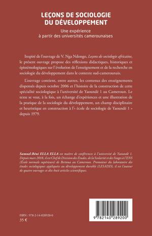 Le présent ouvrage propose des réflexions didactiques, historiques et épistémologiques sur l'évolution de l'enseignement et de la recherche en sociologie du développement dans le contexte sud-camerounais. Il contient, entre autres, les contenus des enseignements dispensés depuis octobre 2006 et l'histoire de la construction de cette spécialité sociologique à l'université de Yaoundé 1 au Cameroun. Le texte se veut, à la fois, un échange d'expériences et une illustration de la pratique de la sociologie du développement, un champ disciplinaire et heuristique en construction à l' « école de sociologie de Yaoundé 1 » depuis 1979.