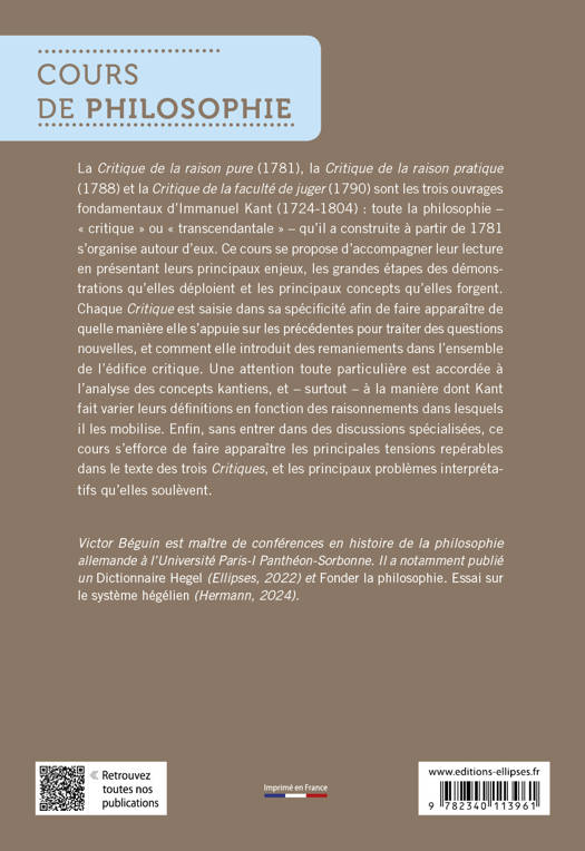 La Critique de la raison pure (1781), la Critique de la raison pratique (1788) et la Critique de la faculté de juger (1790) sont les trois ouvrages fondamentaux d’Immanuel Kant (1724-1804) : toute la philosophie – « critique » ou « transcendantale » – qu’il a construite à partir de 1781 s’organise autour d’eux. Ce cours se propose d’accompagner leur lecture en présentant leurs principaux enjeux, les grandes étapes des démonstrations qu’elles déploient et les principaux concepts qu’elles forgent. Chaque Critique est saisie dans sa spécificité afin de faire apparaître de quelle manière elle s’appuie sur les précédentes pour traiter des questions nouvelles, et comment elle introduit des remaniements dans l’ensemble de l’édifice critique. Une attention toute particulière est accordée à l’analyse des concepts kantiens, et – surtout – à la manière dont Kant fait varier leurs définitions en fonction des raisonnements dans lesquels il les mobilise. Enfin, sans entrer dans des discussions spécialisées, ce cours s’efforce de faire apparaître les principales tensions repérables dans le texte des trois Critiques, et les principaux problèmes interprétatifs qu’elles soulèvent.