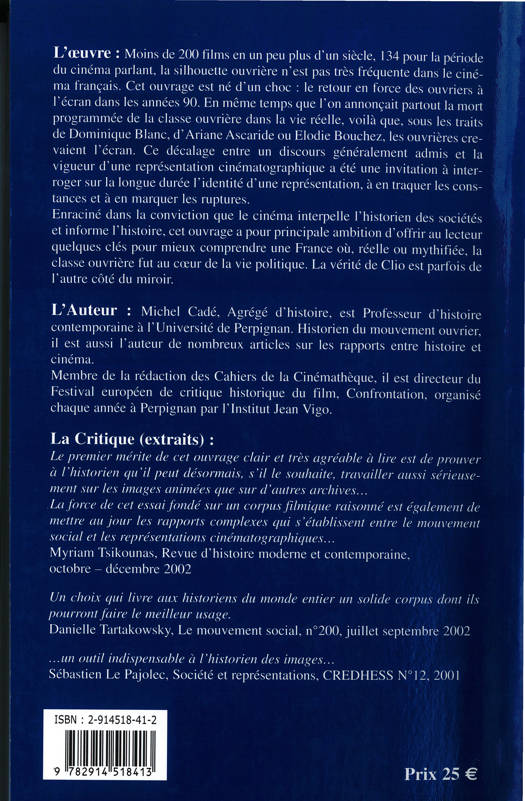 Moins de 200 films en un peu plus d'un siècle, 134 pour la période du cinéma parlant. la silhouette ouvrière n'est pas très fréquente dans le cinéma français. Cet ouvrage est né d'un choc : le retour en force des ouvriers à l'écran dans les années 90. En même temps que l'on annonçait partout la mort programmée de la classe ouvrière dans la vie réelle, voilà que, sous les traits de Dominique Blanc, d'Ariane Ascaride ou Elodie Bouchez. les ouvrières crevaient l'écran. Ce décalage entre un discours généralement admis et la vigueur d'une représentation cinématographique a été une invitation à interroger sur la longue durée l'identité d'une représentation, à en traquer les constances et à en marquer les ruptures.
