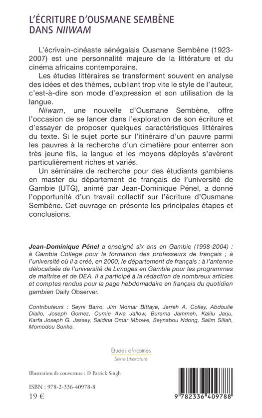 L’écrivain-cinéaste sénégalais Ousmane Sembène (1923-2007) est une personnalité majeure de la littérature et du cinéma africains contemporains. Les études littéraires se transforment souvent en analyse des idées et des thèmes, oubliant trop vite le style de l’auteur, c’est-à-dire son mode d’expression et son utilisation de la langue. Niiwam, une nouvelle d’Ousmane Sembène, offre l’occasion de se lancer dans l’exploration de son écriture et d’essayer de proposer quelques caractéristiques littéraires du texte. Si le sujet porte sur l’itinéraire d’un pauvre parmi les pauvres à la recherche d’un cimetière pour enterrer son très jeune fils, la langue et les moyens déployés s’avèrent particulièrement riches et variés. Un séminaire de recherche pour des étudiants gambiens en master du département de français de l’université de Gambie (UTG), animé par Jean-Dominique Pénel, a donné l’opportunité d’un travail collectif sur l’écriture d’Ousmane Sembène. Cet ouvrage en présente les principales étapes et conclusions.