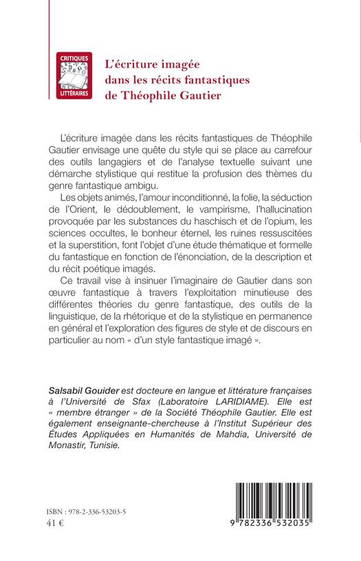 L'écriture imagée dans les récits fantastiques de Théophile Gautier envisage une quête du style qui se place au carrefour des outils langagiers et de l'analyse textuelle suivant une démarche stylistique qui restitue la profusion des thèmes du genre fantastique ambigu. Les objets animés, l'amour inconditionné, la folie, la séduction de l'Orient, le dédoublement, le vampirisme, l'hallucination provoquée par les substances du haschisch et de l'opium, les sciences occultes, le bonheur éternel, les ruines ressuscitées et la superstition, font l'objet d'une étude thématique et formelle du fantastique en fonction de l'énonciation, de la description et du récit poétique imagés. Ce travail vise à insinuer l'imaginaire de Gautier dans son oeuvre fantastique à travers l'exploitation minutieuse des différentes théories du genre fantastique, des outils de la linguistique, de la rhétorique et de la stylistique en permanence en général et l'exploration des figures de style et de discours en particulier au nom d'un style fantastique imagé .