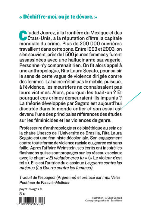 Ciudad Juarez, à la frontière du Mexique et des États-Unis, a la réputation d'être la capitale mondiale du crime. Plus de 200 000 ou vrières travaillent dans cette zone. Entre 1993 et 2003, on s'en souvient, près de 1 500 jeunes femmes y furent assassinées avec une hallucinante sauvagerie. Personne n'y comprenait rien. On fit alors appel à une anthropologue, Rita Laura Segato, pour saisir le sens de cette vague de violence dirigée contre des femmes. La haine n'était pas le mobile, puisque, à l'évidence, les meurtriers ne connaissaient pas leurs victimes. Alors, pourquoi les tuait-on ? Et pourquoi ces crimes demeuraient-ils impunis ? La théorie développée par Segato est aujourd'hui discutée dans le monde entier et son essai est devenu l'une des principales références des études sur les féminicides et les violences de genre.