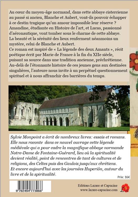 Au coeur du moyen-âge normand, dans cette abbaye cistercienne au passé si ancien, Blanche et Aubert, vont-ils pouvoir échapper à ce destin tragique qu’un amour impossible leur réserve ? Amandine, étudiante en Histoire de l’art, et Lucas, passionné d’aéronautique, vont tomber sous le charme de cette abbaye. La beauté et la sérénité des lieux renferment néanmoins un mystère, celui de Blanche et Aubert. Ce roman est inspiré de « La légende des deux Amants », récit poétique écrit par Marie de France à la fin du XIIe siècle, puisant sa source dans une tradition ancienne, préchrétienne. Au-delà de l’étonnante histoire de ces jeunes gens aux destinées singulières, l’auteure nous invite à un perpétuel questionnement spirituel et à nous affranchir des barrières du temps. Sylvie Monpoint a écrit de nombreux livres: essais et romans. Elle nous raconte dans ce nouvel ouvrage cette légende médiévale qui a pour cadre la magnifique abbaye normande Notre-Dame de Fontaine-Guérard, lieu où la spiritualité devient réalité, point de rencontres de tant de cultures et de religions, des Celtes puis des Gaulois jusqu’aux chrétiens. Et encore aujourd’hui avec les journées Huperiôn, autour du livre et de la spiritualité.