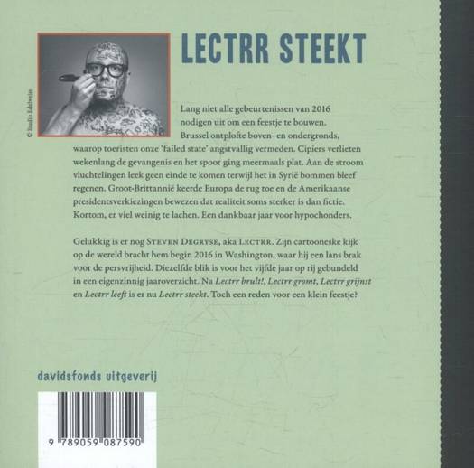 Lang niet alle gebeurtenissen van 2016 nodigen uit om een feestje te bouwen. Muzikanten en artiesten met naam en faam verlieten het ondermaanse. Brussel ontplofte boven- en ondergronds, waarop toeristen onze 'failed state' angstvallig ontweken. Cipiers verlieten wekenlang de gevangenis en het spoor ging meer dan eenmaal plat. Aan de stroom vluchtelingen leek geen einde te komen terwijl het is Syrië bommen bleef regenen. Groot-Brittannië keerde Europa de rug toe en de Amerikaanse presidentsverkiezingen bewezen dat realiteit soms sterker is dan fictie. Kortom, er viel weinig te lachten. Typisch een jaar voor de geschiedenisboekjes. Een dankbaar jaar voor hypochondrische jaaroverzichten. Gelukkig is er nog Steven Degryse, aka Lectrr. Zijn cartooneske kijk op de wereld bracht hem begin 2016 in Washington waar hij een lans brak voor persvrijheid. Diezelfde blik is voor het vijfde jaar op rij gebundeld in een eigenzinnig jaaroverzicht. Na Lectrr brult, Lectrr gromt, Lectrr grijnst en Lectrr leeft, is er nu Lectrr steekt. Toch een reden voor een klein feestje?