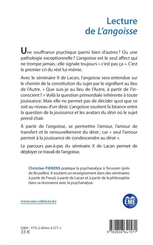 Avec le séminaire X de Lacan, l'angoisse sera entendue sur le chemin de la constitution du sujet par le signifiant au lieu de l'Autre. Que suis-je au lieu de l'Autre, à partir de l'inconscient ? Voilà la question primordiale inhérente à toute jouissance. Mais elle ne permet pas de décider quoi que ce soit au niveau d'un désir. L'angoisse soutient la béance entre la question de la jouissance et les avatars du désir où le sujet prend chair.