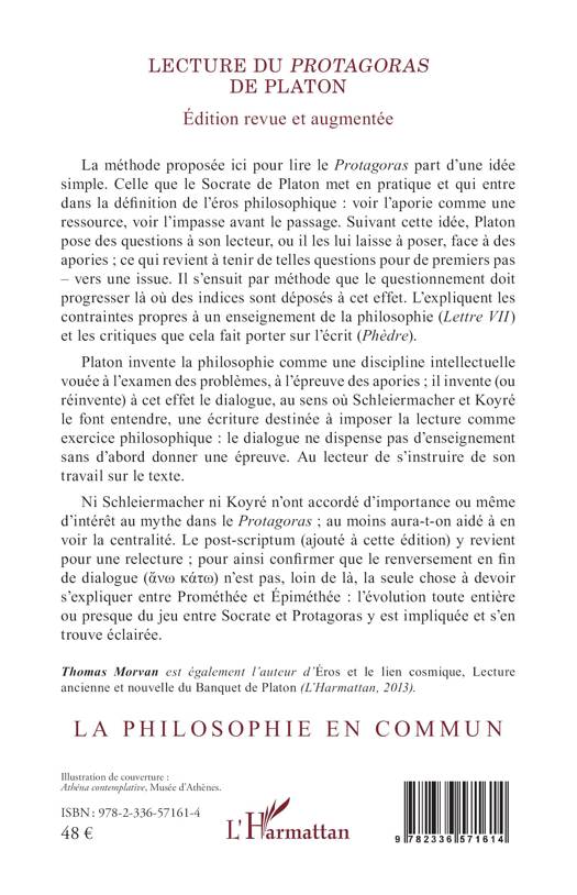La méthode proposée ici pour lire le Protagoras part d'une idée simple. Celle que le Socrate de Platon met en pratique et qui entre dans la définition de l'éros philosophique: voir l'aporie comme une ressource, voir l'impasse avant le passage. Suivant cette idée, Platon pose des questions à son lecteur, ou il les lui laisse à poser, face à des apories; ce qui revient à tenir de telles questions pour de premiers pas - vers une issue. Il s'ensuit par méthode que le questionnement doit progresser là où des indices sont déposés à cet effet. L'expliquent les contraintes propres à un enseignement de la philosophie (Lettre VII) et les critiques que cela fait porter sur l'écrit (Phèdre). Platon invente la philosophie comme une discipline intellectuelle vouée à l'examen des problèmes, à l'épreuve des apories; il invente (ou réinvente) à cet effet le dialogue, au sens où Schleiermacher et Koyré le font entendre, une écriture destinée à imposer la lecture comme exercice philosophique: le dialogue ne dispense pas d'enseignement sans d'abord donner une épreuve. Au lecteur de s'instruire de son travail sur le texte. Ni Schleiermacher ni Koyré n'ont accordé d'importance ou même d'intérêt au mythe dans le Protagoras; au moins aura-t-on aidé à en voir la centralité. Le post-scriptum (ajouté à cette édition) y revient pour une relecture; pour ainsi confirmer que le renversement en fin de dialogue (ἄνω κάτω) n'est pas, loin de là, la seule chose à devoir s'expliquer entre Prométhée et Épiméthée: l'évolution toute entière ou presque du jeu entre Socrate et Protagoras y est impliquée et s'en trouve éclairée.
