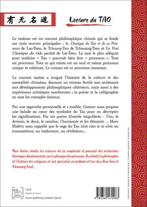Le taoïsme est un courant philosophique chinois qui se fonde sur trois œuvres principales : le « Classique du Tao et de sa Puissance » de Lao-Tseu, le « Tchouang-Tseu » de Tchouang-Tseu et « Le Vrai Classique du vide parfait » de Lie-Tseu. Le mot le plus adéquat pour traduire « Tao » pourrait bien être « processus ». Tout est processus. Tout ce qui existe est un seul et même processus unique et cohérent. Le cosmos est ce processus immense. Le courant taoïste a irrigué l’histoire de la culture et des mentalités chinoises, donnant un terreau fertile non seulement aux développements philosophiques ultérieurs, mais aussi à des expériences artistiques nombreuses ; la poésie et la calligraphie en sont les exemples fameux. Par une approche personnelle et sensible, l’auteur nous propose une balade au cœur des symboles du Tao pour en décrypter les significations. Par six portes d’entrée singulières – l’un, le devenir, le deux, le nombre, l’harmonie et les éléments –, Marc Halévy nous rappelle que le sage du Tao n’est rien si ce n’est un transmetteur, un traducteur, un révélateur…