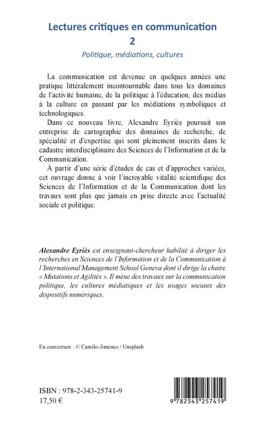 La communication est devenue en quelques années une pratique littéralement incontournable dans tous les domaines de l'activité humaine, de la politique à l'éducation, des médias à la culture en passant par les médiations symboliques et technologiques. Dans ce nouveau livre, Alexandre Eyries poursuit son entreprise de cartographie des domaines de recherche, de spécialité et d'expertise qui sont pleinement inscrits dans le cadastre interdisciplinaire des Sciences de l'Information et de la Communication. À partir d'une série d'études de cas et d'approches variées, cet ouvrage donne à voir l'incroyable vitalité scientifique des Sciences de l'Information et de la Communication dont les travaux sont plus que jamais en prise directe avec l'actualité sociale et politique.