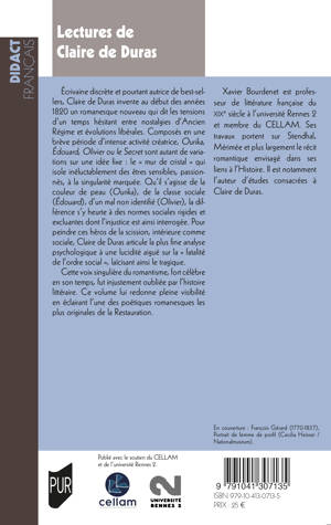 Écrivaine discrète et pourtant autrice de best-sellers, Claire de Duras invente au début des années 1820 un romanesque nouveau qui dit les tensions d’un temps hésitant entre nostalgies d’Ancien Régime et évolutions libérales. Composés en une brève période d’intense activité créatrice, Ourika, Édouard, Olivier ou le Secret sont autant de variations sur une idée fixe : le « mur de cristal » qui isole inéluctablement des êtres sensibles, passionnés, à la singularité marquée. Qu’il s’agisse de la couleur de peau (Ourika), de la classe sociale (Édouard), d’un mal non identifié (Olivier), la différence s’y heurte à des normes sociales rigides et excluantes dont l’injustice est ainsi interrogée. Pour peindre ces héros de la scission, intérieure comme sociale, Claire de Duras articule la plus fine analyse psychologique à une lucidité aiguë sur la « fatalité de l’ordre social », laïcisant ainsi le tragique. Cette voix singulière du romantisme, fort célèbre en son temps, fut injustement oubliée par l’histoire littéraire. Ce volume lui redonne pleine visibilité en éclairant l’une des poétiques romanesques les plus originales de la Restauration.
