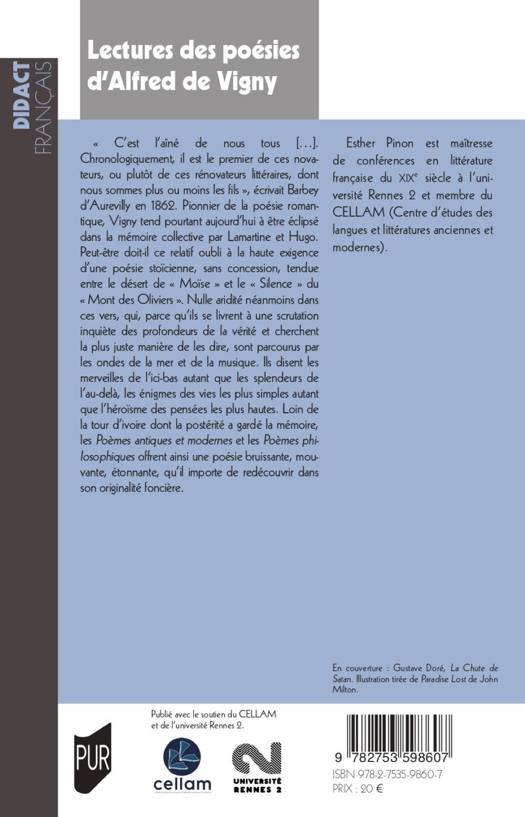 « C’est l’aîné de nous tous [...]. Chronologiquement, il est le premier de ces nova- teurs, ou plutôt de ces rénovateurs littéraires, dont nous sommes plus ou moins les fils », écrivait Barbey d’Aurevilly en 1862. Pionnier de la poésie roman- tique, Vigny tend pourtant aujourd’hui à être éclipsé dans la mémoire collective par Lamartine et Hugo. Peut-être doit-il ce relatif oubli à la haute exigence d’une poésie stoïcienne, sans concession, tendue entre le désert de « Moïse » et le « Silence » du « Mont des Oliviers ». Nulle aridité néanmoins dans ces vers, qui, parce qu’ils se livrent à une scrutation inquiète des profondeurs de la vérité et cherchent la plus juste manière de les dire, sont parcourus par les ondes de la mer et de la musique. Ils disent les merveilles de l’ici-bas autant que les splendeurs de l’au-delà, les énigmes des vies les plus simples autant que l’héroïsme des pensées les plus hautes. Loin de la tour d’ivoire dont la postérité a gardé la mémoire, les Poèmes antiques et modernes et les Poèmes phi- losophiques offrent ainsi une poésie bruissante, mou- vante, étonnante, qu’il importe de redécouvrir dans son originalité foncière.