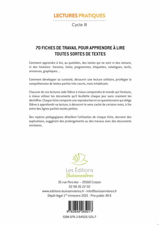 70 fiches de travail pour apprendre à lire toutes sortes de textes. Version mise à jour et en couleur : L’ouvrage est édité depuis 1998. Il a déjà été vendu à plus de 10 000 exemplaires (soit environ un million d’utilisateurs). Dans cette 6e édition, tous les documents sont en couleur et mis à jour selon les visuels et packaging de notre époque.Comment apprendre à lire, au quotidien, des textes qui ne sont ni des romans, ni des histoires : horaires, listes, programmes, étiquettes, catalogues, tarifs, annonces, graphiques... Le principe de l’ouvrage : apprendre à lire tous les textes que l’on rencontre au quotidien : publicités, emballages, tickets, pièces d’identité, panneaux d’affichage… Chacune de ces lectures aide l'élève à mieux comprendre le monde qui l'entoure, à mieux utiliser les documents qu'il feuillette chaque jour sans vraiment les déchiffrer. Chaque fiche comporte une reproduction et un questionnaire qui oblige l'élève à approfondir sa lecture, à découvrir le sens caché de certains mots, à lire entre des lignes parfois toutes petites.