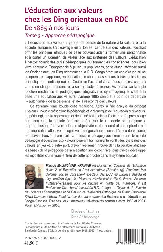 Ce troisième tome analyse le concept « valeur » et présente la pédagogie et la didactique de l'éducation aux valeurs. Son enjeu est d'avoir trouvé, d'une part, la médiation pédagogique comme une forme de pédagogie d'éducation aux valeurs pouvant harmoniser le conflit des systèmes des valeurs en jeu et, d'autre part, d'avoir réellement trouvé dans la palabre africaine les bases de la pédagogie de la médiation socio-cognitive, puis d'avoir développé les modalités d'une vraie entrée de cette approche dans le système éducatif.