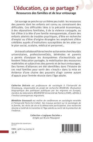 Cet ouvrage se penche sur un thème peu traité les ressources des parents dont les enfants ont connu ou connaissent des difficultés. Ces difficultés liées à la précarité économique, à des séparations familiales, à de la violence conjugale, au fait d'être à la tête d'une famille monoparentale, d'avoir des enfants atteints de troubles psychiques, d'être en recherche d'emploi ou d'être d'origine étrangère les empêchent d'être crédibles auprès d'institutions susceptibles de les aider sur le plan social, scolaire, médical et personnel... Un travail collaboratif de recherche-action entre chercheur(e)s universitaires, professionnel(le)s, bénévoles et parents a permis d'analyser les écosystèmes d'acteur(rice)s qui fondent l'éducation partagée, la mobilisation des ressources matérielles et subjectives des parents et de leurs entourages. Des formes d'alliances ont été identifiées dans l'histoire de ces neuf familles pour sortir des inouïs dans la mise en évidence d'une chaine des pouvoirs d'agir comme autant d'appuis pour l'entrée réussie dans l'âge adulte.