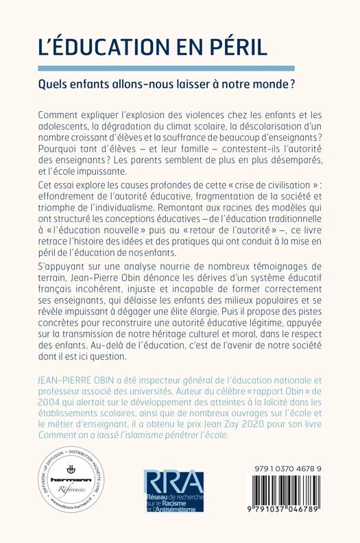 S’appuyant sur une analyse nourrie de nombreux témoignages de terrain, Jean-Pierre Obin dénonce les dérives d’un système éducatif français incohérent, injuste et incapable de former correctement ses enseignants, qui délaisse les enfants des milieux populaires et se révèle impuissant à dégager une élite élargie. Puis il propose des pistes concrètes pour reconstruire une autorité éducative légitime, appuyée sur la transmission de notre héritage culturel et moral, dans le respect des enfants.