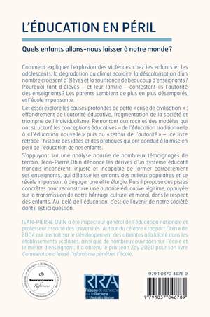 Cet essai explore les causes profondes de cette « crise de civilisation » : effondrement de l’autorité éducative, fragmentation de la société et triomphe de l’individualisme. Remontant aux racines des modèles qui ont structuré les conceptions éducatives – de l’éducation traditionnelle à « l’éducation nouvelle » puis au « retour de l’autorité » –, ce livre retrace l'histoire des idées et des pratiques qui ont conduit à la mise en péril de l’éducation de nos enfants.