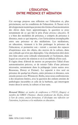 Cet ouvrage propose une réflexion sur l'éducation et ses conditions. A l'heure où le développement numérique promet des formes d'autonomisation des élèves dans leurs apprentissages, la question se pose de ce qui fait le prix d'une présence éducative. Car ce qui importe, c'est l'articulation irremplçable entre une présence et des médiations. Il s'agira donc d'abord de mettre en perspective l'idéal d'une autonomisation précoce et de maintenir l'idée d'une présence nécessaire (notamment dans la pédagogie).