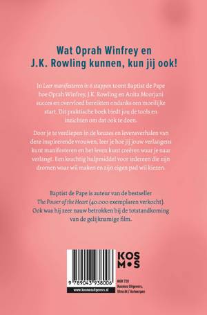 In Leer manifesteren in 6 stappen toont Baptist de Pape hoe Oprah Winfrey, J.K. Rowling en Anita Moorjani succes en overvloed bereikten, ondanks een moeilijke start. Dit praktische boek biedt jou de tools en inzichten om hetzelfde te doen. Door je te verdiepen in de keuzes en levensverhalen van deze inspirerende vrouwen, leer je hoe jij jouw verlangens kunt manifesteren en het leven kunt creëren dat bij je past. Een krachtig hulpmiddel voor iedereen die zijn dromen waarwil maken en zijn eigen pad kiezen.