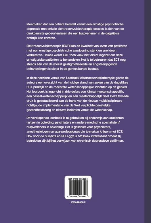In deze herziene versie van Leerboek elektroconvulsietherapie geven de auteurs een overzicht van de huidige stand van zaken van de dagelijkse ECT-praktijk en de recentste wetenschappelijke inzichten op dit gebied. Het leerboek is ingericht in drie delen: een klinisch-wetenschappelijk, een basaal-wetenschappelijk en een maatschappelijk deel. Deze tweede druk is geactualiseerd aan de hand van de nieuwe multidisciplinaire richtlijn, de implementatie van de Wet verplichte geestelijke gezondheidszorg en nieuwe inzichten vanuit de wetenschap.