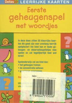 In deze doos zitten 50 kaarten die goed zijn voor urenlang leerrijk spelplezier! Met de vrolijke en kleurrijke plaatjes kan uw kind memory spelen, maar ook nog andere leuke geheugen- en observatiespelletjes. Spelenderwijs zal uw kind dus: - het geheugen trainen - de concentratie oefenen - goed leren waarnemen