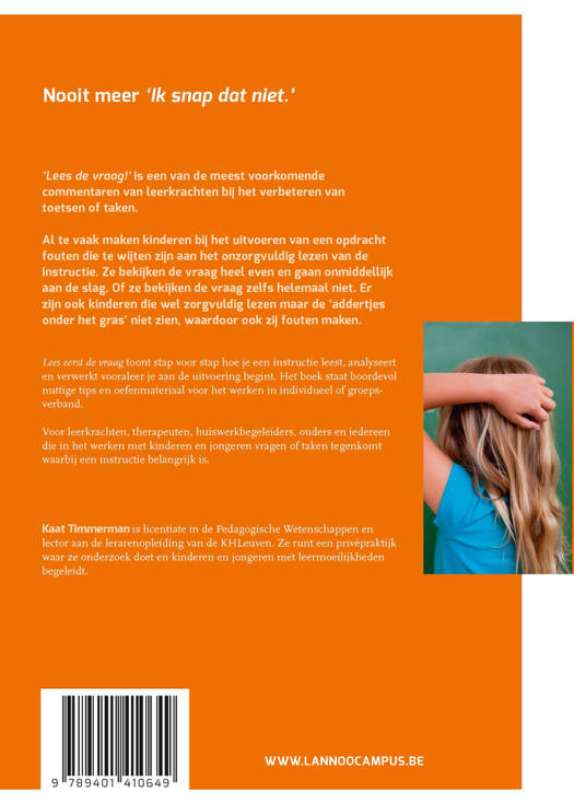 Nooit meer 'Ik snap dat niet' Al te vaak maken kinderen bij het uitvoeren van een opdracht fouten die te wijten zijn aan het onzorgvuldig lezen van de instructie. Ze bekijken de vraag heel even en gaan onmiddellijk aan de slag. Of ze bekijken de vraag zelfs helemaal niet. Er zijn ook kinderen die wel zorgvuldig lezen maar de 'addertjes onder het gras' niet zien, waardoor ook zij fouten maken. Lees eerst de vraag toont stap voor stap hoe je een instructie leest, analyseert en verwerkt vooraleer je aan de uitvoering begint. Het boek staat boordevol nuttige tips en oefenmateriaal voor het werken in individueel of groepsverband. Voor leerkrachten, therapeuten, huiswerkbegeleiders, ouders en iedereen die in het werken met kinderen en jongeren vragen of taken tegenkomt waarbij een instructie belangrijk is.