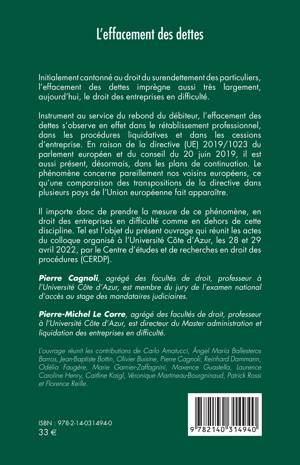 Initialement cantonné au droit du surendettement des particuliers, l'effacement des dettes imprègne aussi très largement, aujourd'hui, le droit des entreprises en difficulté. Instrument au service du rebond du débiteur, l'effacement des dettes s'observe en effet dans le rétablissement professionnel, dans les procédures liquidatives et dans les cessions d'entreprise. En raison de la directive (UE) 2019/1023 du parlement européen et du conseil du 20 juin 2019, il est aussi présent, désormais, dans les plans de continuation. Le phénomène concerne pareillement nos voisins européens, ce qu'une comparaison des transpositions de la directive dans plusieurs pays de l'Union européenne fait apparaître. Il importe donc de prendre la mesure de ce phénomène, en droit des entreprises en difficulté comme en dehors de cette discipline.