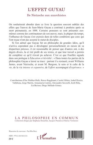 On souhaiterait aborder dans ce livre la question souvent oubliée des effets que l'oeuvre de Jean-Marie Guyau a continué à produire après sa mort prématurée, en 1888. Certains penseurs se sont présentés eux-mêmes comme des continuateurs de son oeuvre, mais, la plupart du temps, l'influence de Guyau s'est exercée dans de telles conditions que ceux qui l'ont reçue n'ont pas assumé le statut de disciples.