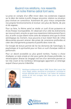 La prise en compte d'un effet miroir dans nos existences s'appuie sur le désir de mettre à profit chaque rencontre, relation ou situation pour évoluer en conscience. Autrement dit, pour mieux comprendre nos propres fonctionnements et évoluer vers plus de liberté, de joie et de sagesse. Pour ce faire, le thème astral se révèle un outil d'une puissance et d'une finesse incomparables. En observant d'un côté les événements qui nous arrivent, ensuite ce que nous ressentons intérieurement face à eux, et enfin ce que disent notre carte de naissance ainsi que le climat astrologique du moment, nous pouvons à tout instant faire de riches découvertes pouvant amener des prises de conscience profondes et créer des changements puissants et positifs dans notre vie. Ce triangle de lecture permet de lier les domaines de l'astrologie, la psychologie et la spiritualité pour en faire un outil d'analyse inédit et performant. Pour un abord accessible au plus grand nombre, l'auteur a choisi d'adopter un style simple et clair pour parler de choses profondes. La retranscription directe du langage oral lors d'un séminaire permet un ton très vivant et les nombreux témoignages apportent un éclairage auquel chacun pourra s'identifier.