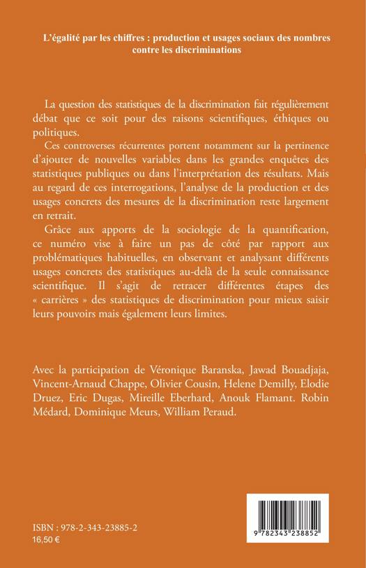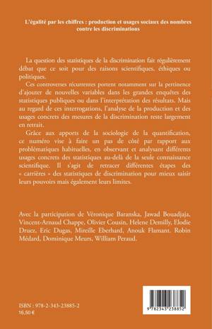 La question des statistiques de la discrimination fait régulièrement débat que ce soit pour des raisons scientifiques, éthiques ou politiques. Ces controverses récurrentes portent notamment sur la pertinence d'ajouter de nouvelles variables dans les grandes enquêtes des statistiques. Mais au regard de ces interrogations, l'analyse de la production et des usages concrets des mesures de la discrimination reste largement en retrait. Grâce aux apports de la sociologie de la quantification, ce numéro vise à faire un pas de côté par rapport aux problématiques habituelles, en observant et analysant différents usages concrets des statistiques au-delà de la seule connaissance scientifique.